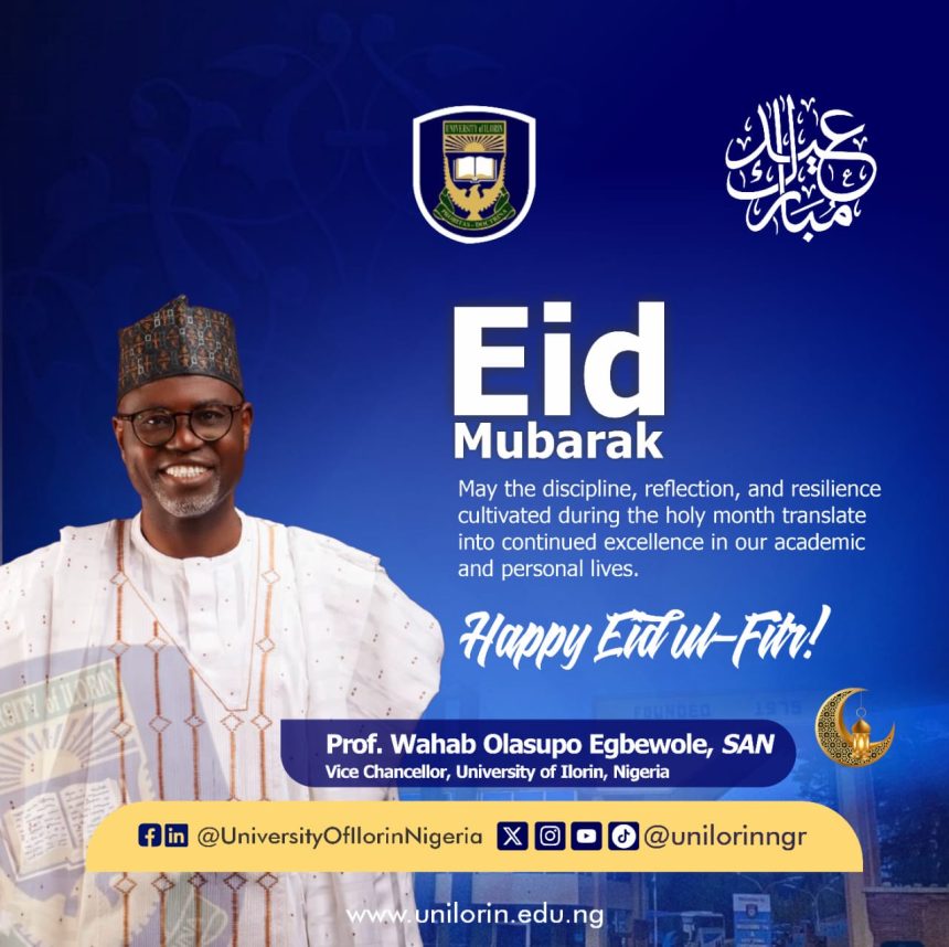 As this year's Ramadan fast ends, the Vice Chancellor of the University of Ilorin, Prof. Wahab Olasupo Egbewole, SAN, has congratulated members of the University Muslim community and their counterparts…