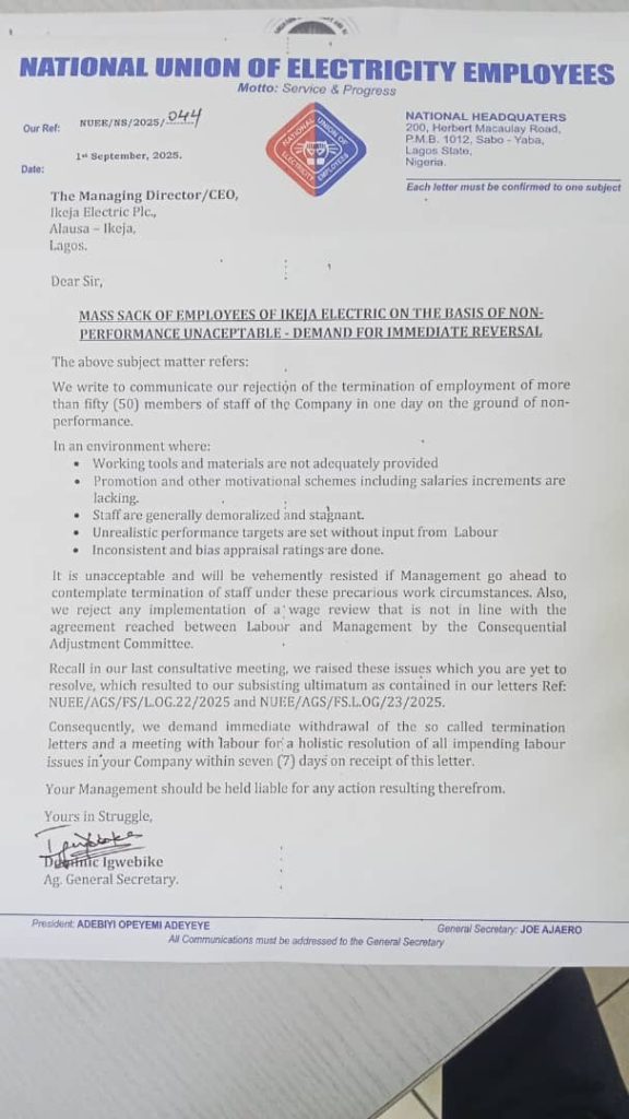 In a protest letter addressed to the Managing Director/CEO of Ikeja Electric, the union rejected the mass sack, which the company claimed was based on “non-performance.” NUEE stated that the terminations were carried out despite glaring systemic challenges that hinder staff productivity.